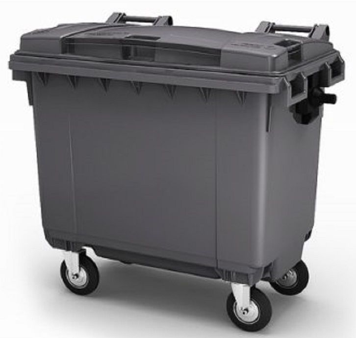 - Пластиковый мусорный контейнер 660 л. с крышкой, на 4-х колесах.
