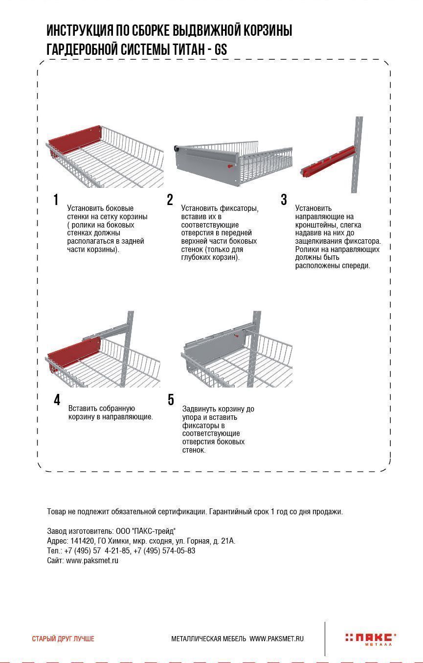 В комплект входят несущие рельсы и навесные направляющие, полки, штанги, аксессуары, крепежные элементы. Можно докупить множество дополнительных компонентов для гардеробной системы.