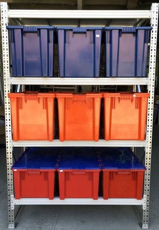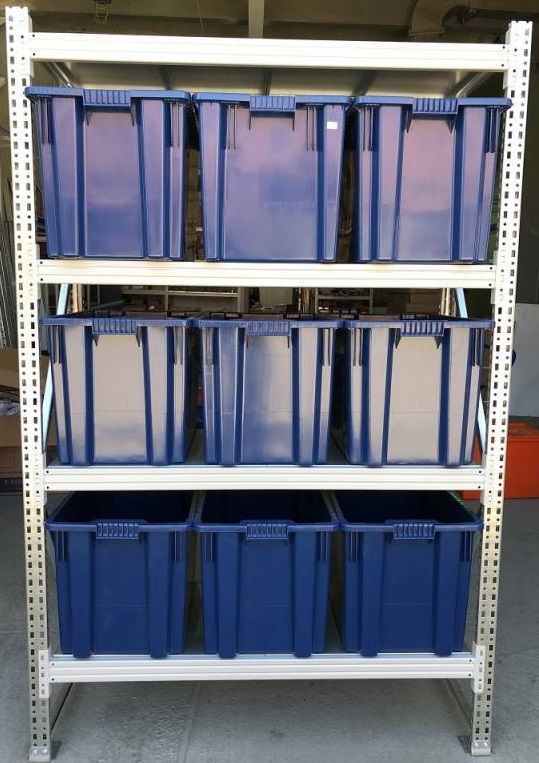 - Верхняя полка без пластиковых ящиков уже входит в стоимость стеллажа и при расчёте количества полок не учитывается. Учитываются только полки с пластиковыми ящиками.