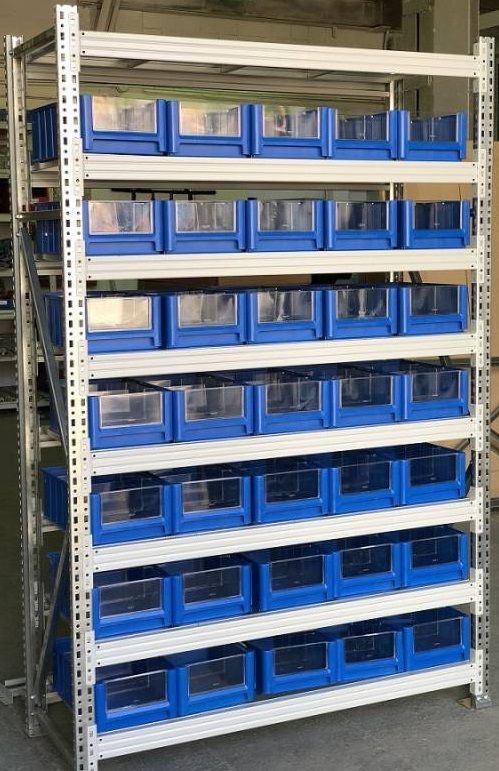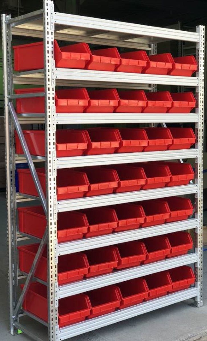 - Верхняя полка без пластиковых ящиков уже входит в стоимость стеллажа и при расчёте количества полок не учитывается. Учитываются только полки с пластиковыми ящиками.