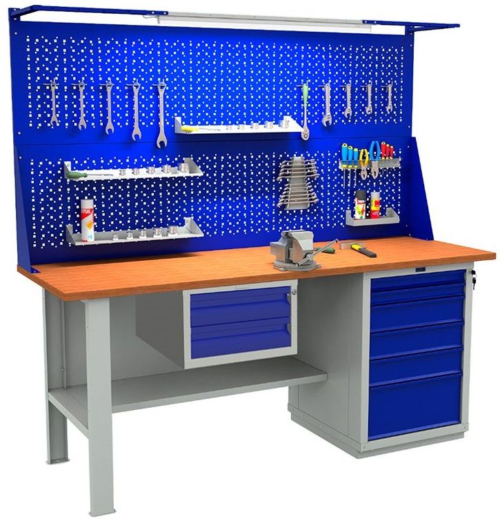 - Дополнительно верстак можно укомплектовать перфорированным экраном соответствующего размера, светодиодным освещением и аксессуарами для инструментов.