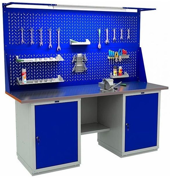 - Дополнительно верстак можно укомплектовать перфорированным экраном соответствующего размера, светодиодным освещением и аксессуарами для инструментов.