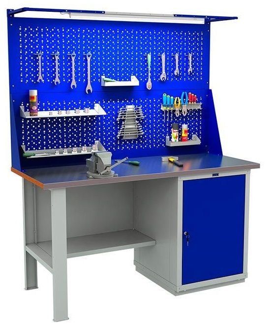 - Дополнительно верстак можно укомплектовать перфорированным экраном соответствующего размера, светодиодным освещением и аксессуарами для инструментов.