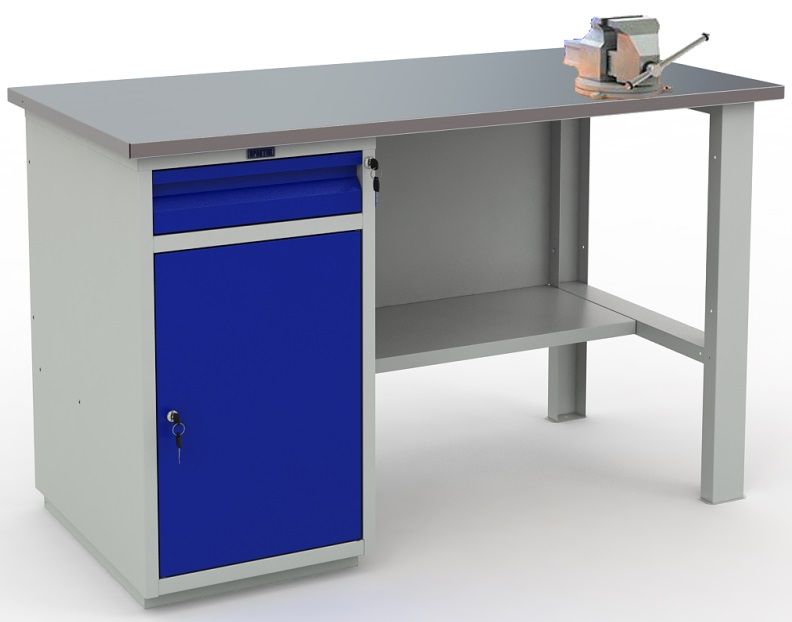 - Верстак окрашен порошковой краской, цвет покрытия корпуса - серый шагрень (RAL 7038), лицевая панель дверцы тумбы – синий шагрень (RAL 5002).